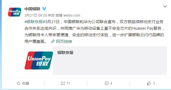 昨天,中國銀聯(lián)和華為公司聯(lián)合宣布,兩邊就連續(xù)移動付出事務協(xié)作關系達成共識,一起推行華為移動設備上根據(jù)安全芯片的Huawei Pay效勞,為銀聯(lián)持卡人帶來更快捷、安全的移動付出體會,進一步拓展銀聯(lián)云閃付品牌的用戶覆蓋面。